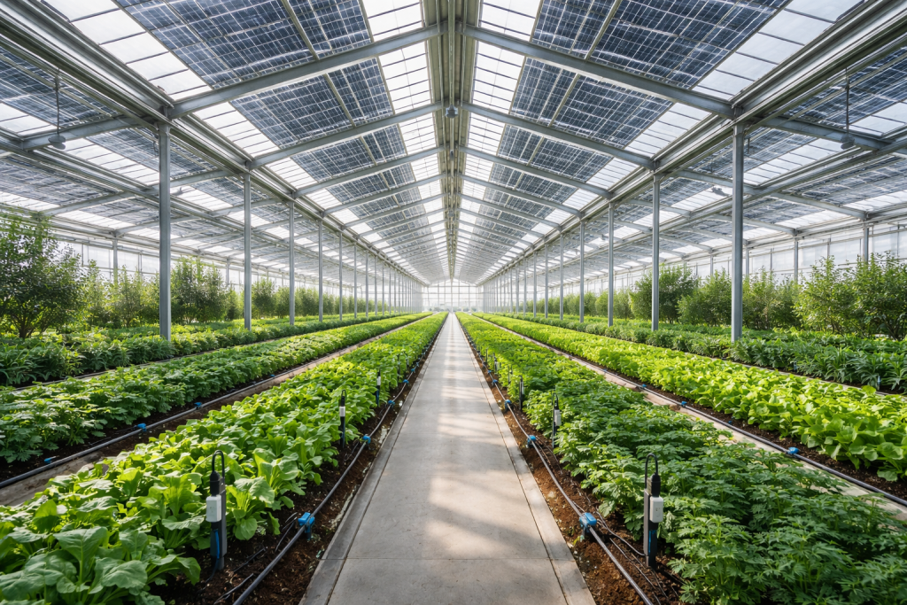 گلخانههای اگریولتائیک با یکپارچهسازی سامانههای خورشیدی در سازه گلخانه، امکان تولید همزمان برق و محصولات کشاورزی را فراهم میکنند.